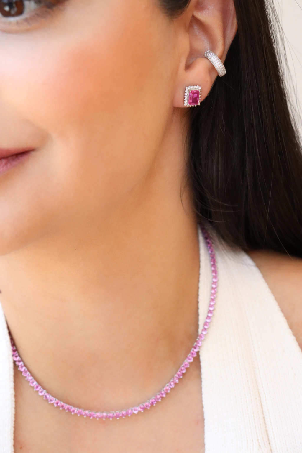 Moderno e elegante, este brinco em Prata 925 apresenta zircônia rosa pink em formato quadrado, cravejadas para refletir brilho intenso e sofisticação. Uma peça versátil e atemporal, perfeita para iluminar o visual com charme, seja no dia a dia ou em ocasiões especiais.