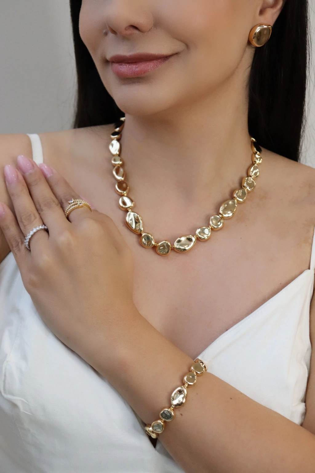 Com design contemporâneo, este colar valoriza a beleza das formas naturais com sofisticação. O banho ouro realça sua elegância atemporal, tornando-o perfeito para qualquer ocasião.