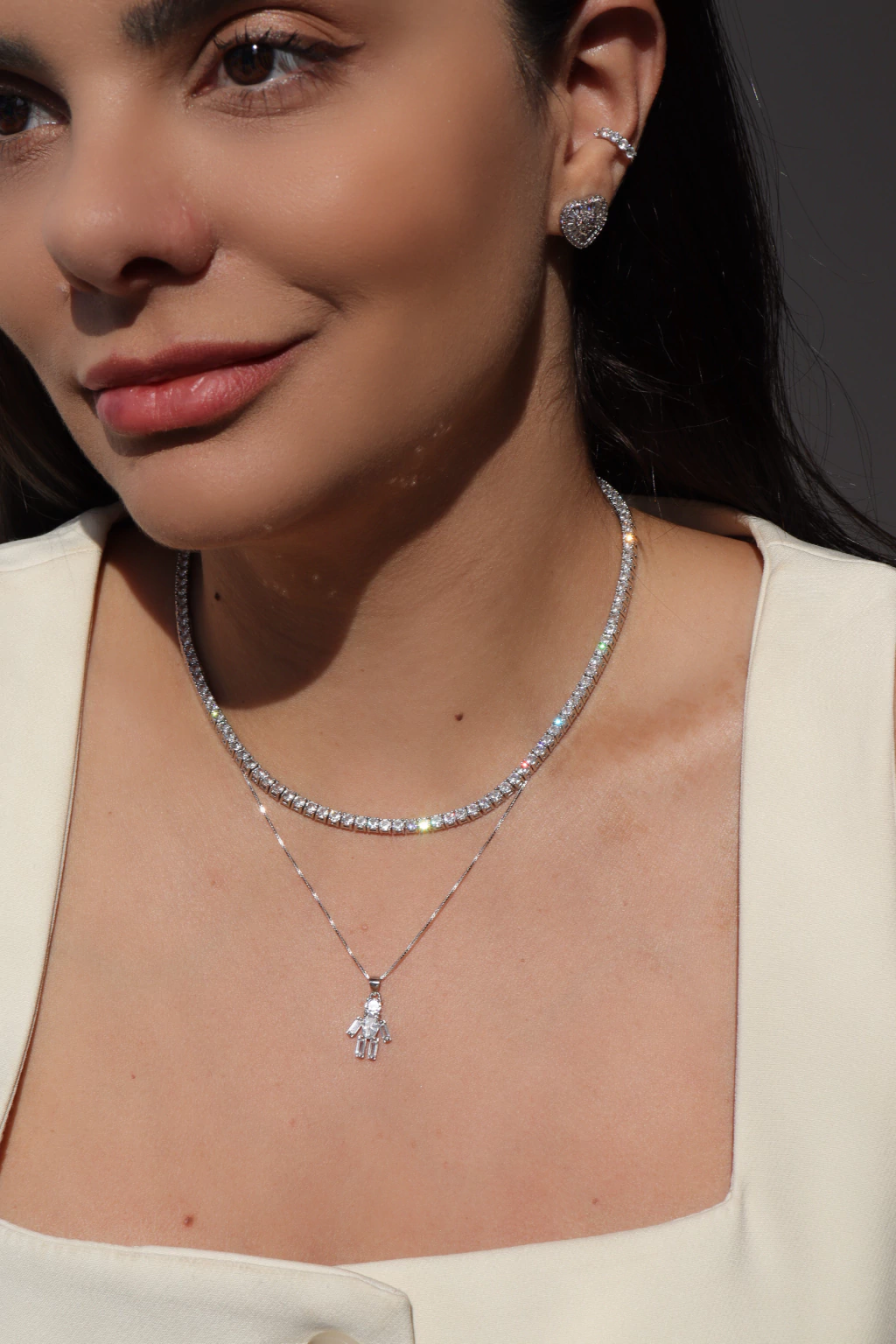 Delicado e encantador, este combo une o brilho sofisticado do colar Riviera, com quatro pontos cravejados de zircônias, ao charme simbólico do colar menina em prata 925, totalmente cravejado. Perfeito para sobreposição, trazendo elegância, delicadeza e personalidade ao visual.