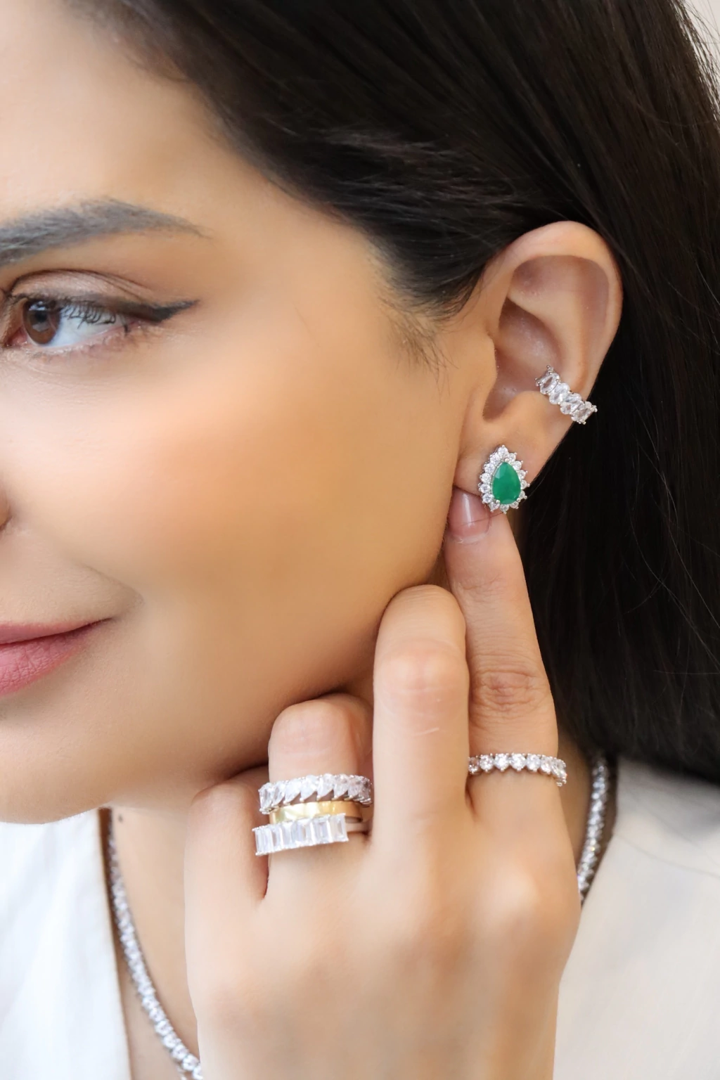 Delicado e sofisticado, este conjunto em banho ródio apresenta pedras cor esmeralda em lapidação gota, cravejadas com zircônias que ressaltam seu brilho e elegância. Versátil e atemporal, pode ser usado sozinho como protagonista ou combinado com outras peças Riviera para composições modernas e cheias de estilo.
