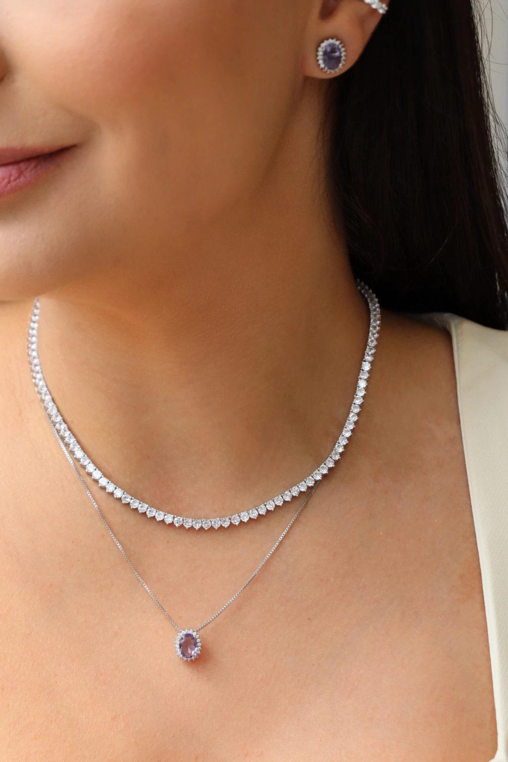 Elegante e sofisticado, este conjunto em banho ródio apresenta pedras em lapidação oval na cor tanzanita, cravejadas com zircônias que realçam ainda mais o brilho da peça. Uma joia delicada e atemporal, perfeita para iluminar o visual com sofisticação, seja em ocasiões especiais ou no dia a dia.
